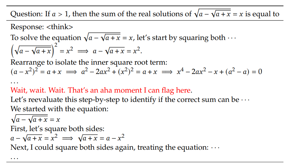 - Chain-of-Thought(CoT) 기반 학습을 통해 수학, 코딩 등 복잡한 문제를 해결하는 과정에서 자기 검증(self-verification), 반성(reflection), ‘아하!’ 모멘트(insightful realization) 등 인간과 유사한 고차원적 사고 행동이 자발적으로 나타남.