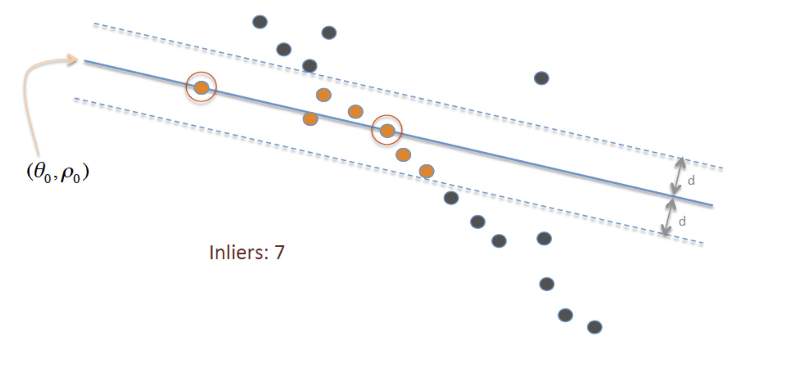 방금 추정한 임시 모델을 전체 데이터에 적용하여 잘 맞는 점을 Inlier, 맞지 않는 점을 Outlier으로 구분합니다.